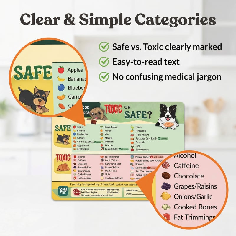 Denna magnet är utformad som en snabbguide och visar tydligt vilka livsmedel som är säkra och vilka som är giftiga för hundar och katter. En blick räcker.